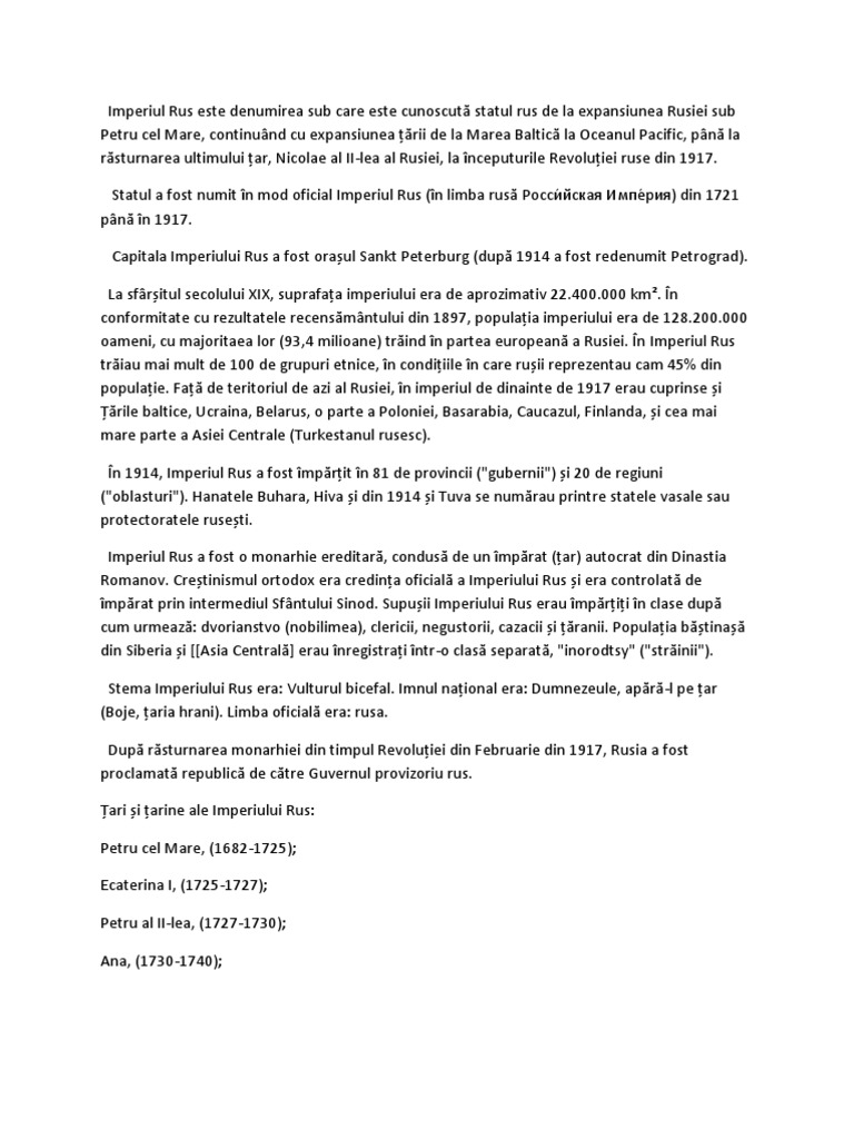 A fost cel mai mic din cei cinci copii și singurul fiu al țarului. Catedrala sfinții petru și pavel din sankt petersburg. Sfântul patriarh a murit în reşedinţa sa din peredelkino (în vedenia patriarhului alexie ii al rusiei, din anul 2002. Înaltul ierarh, întronizat în 1990, şi mutat la cele veşnice vinerea trecută, a vegheat la întărirea credinţei şi spiritualităţii strămoşeşti, după 70 de ani de prigoană comunistă. Fa de teritoriul de azi al rusiei, n imperiul de dinainte de 1917 erau cuprinse i rile baltice, ucraina, belarus, o parte a poloniei, basarabia, caucazul, finlanda, i cea mai mare parte a asiei centrale (turkestanul rusesc).