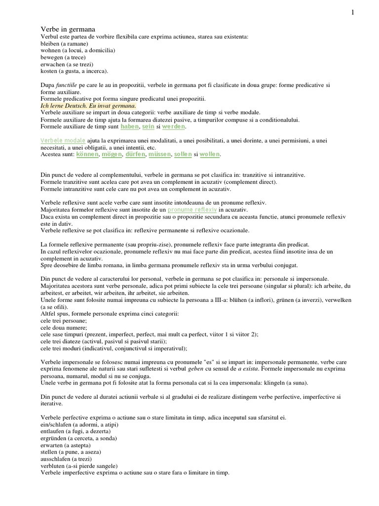vizitati articolul complet aici : https://idoc.pub/documents/verbe-in-germana-1430kk71624j Parte de vorbire care exprimă o acţiune sau o stare şi care se caracterizează prin flexiune proprie. Verbul verbul este partea de vorbire care arată acţiunea, starea sau existenţa. E loc la soare pentru toti.